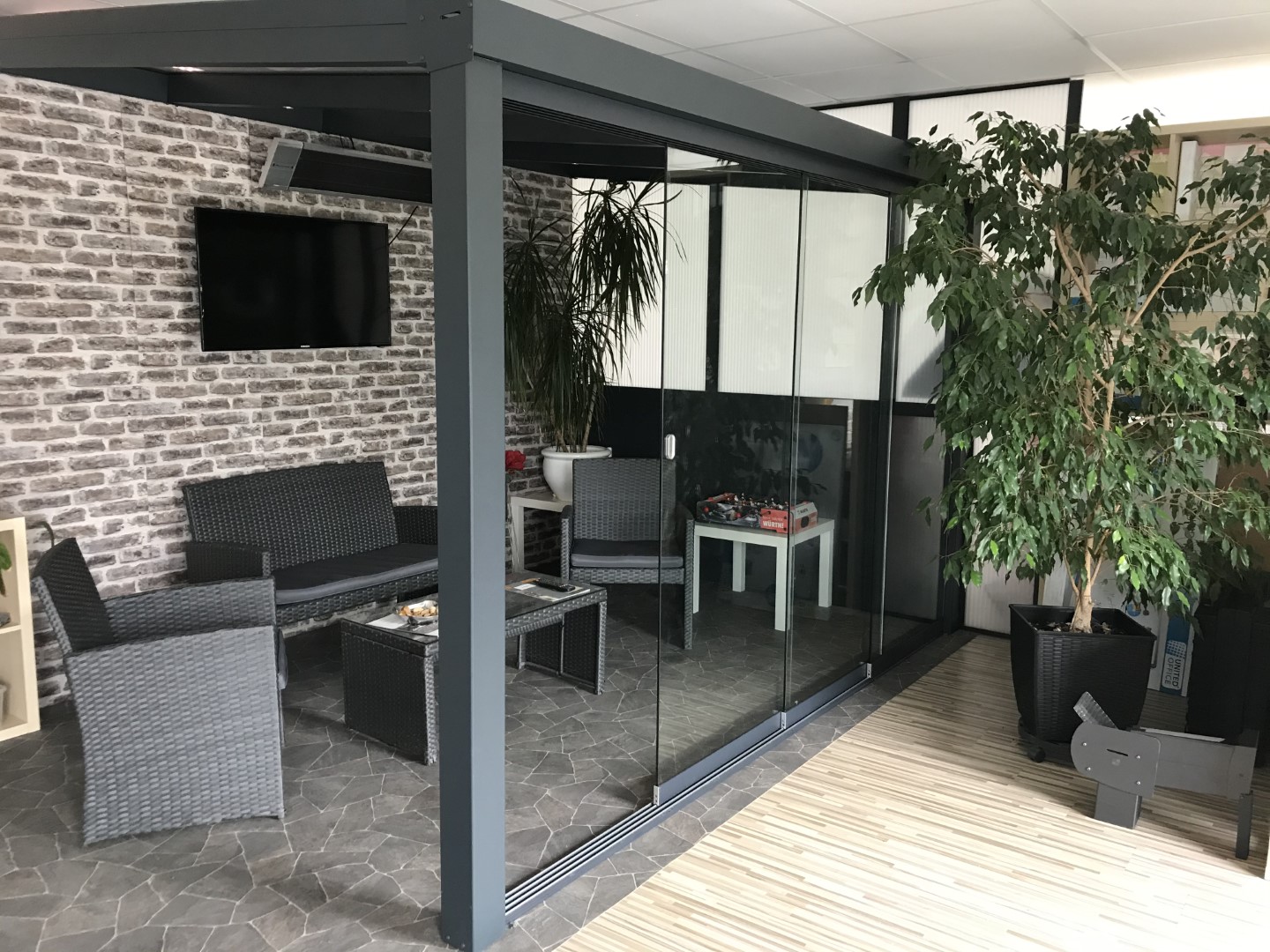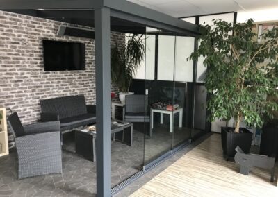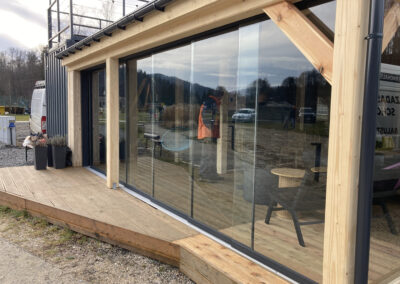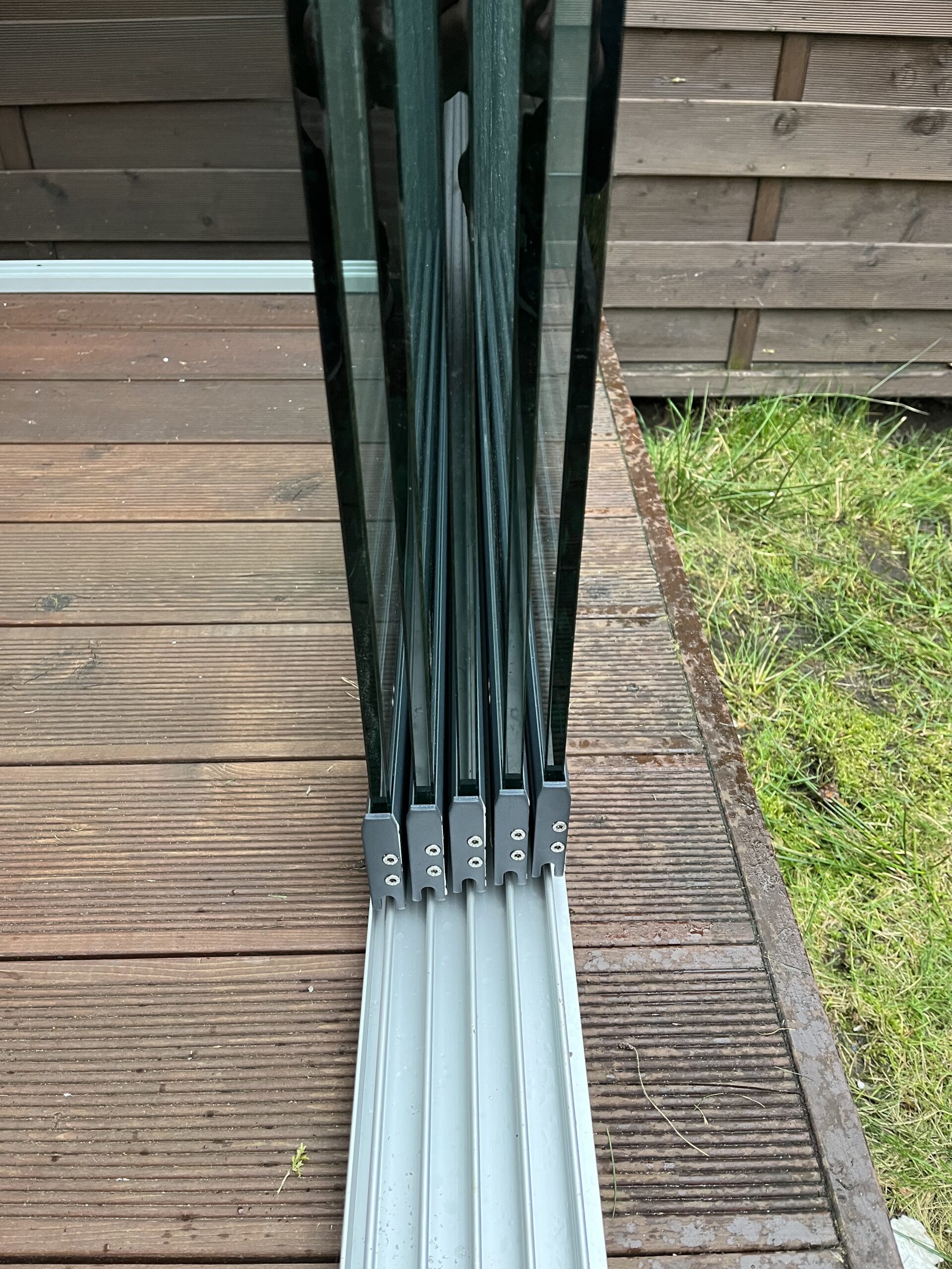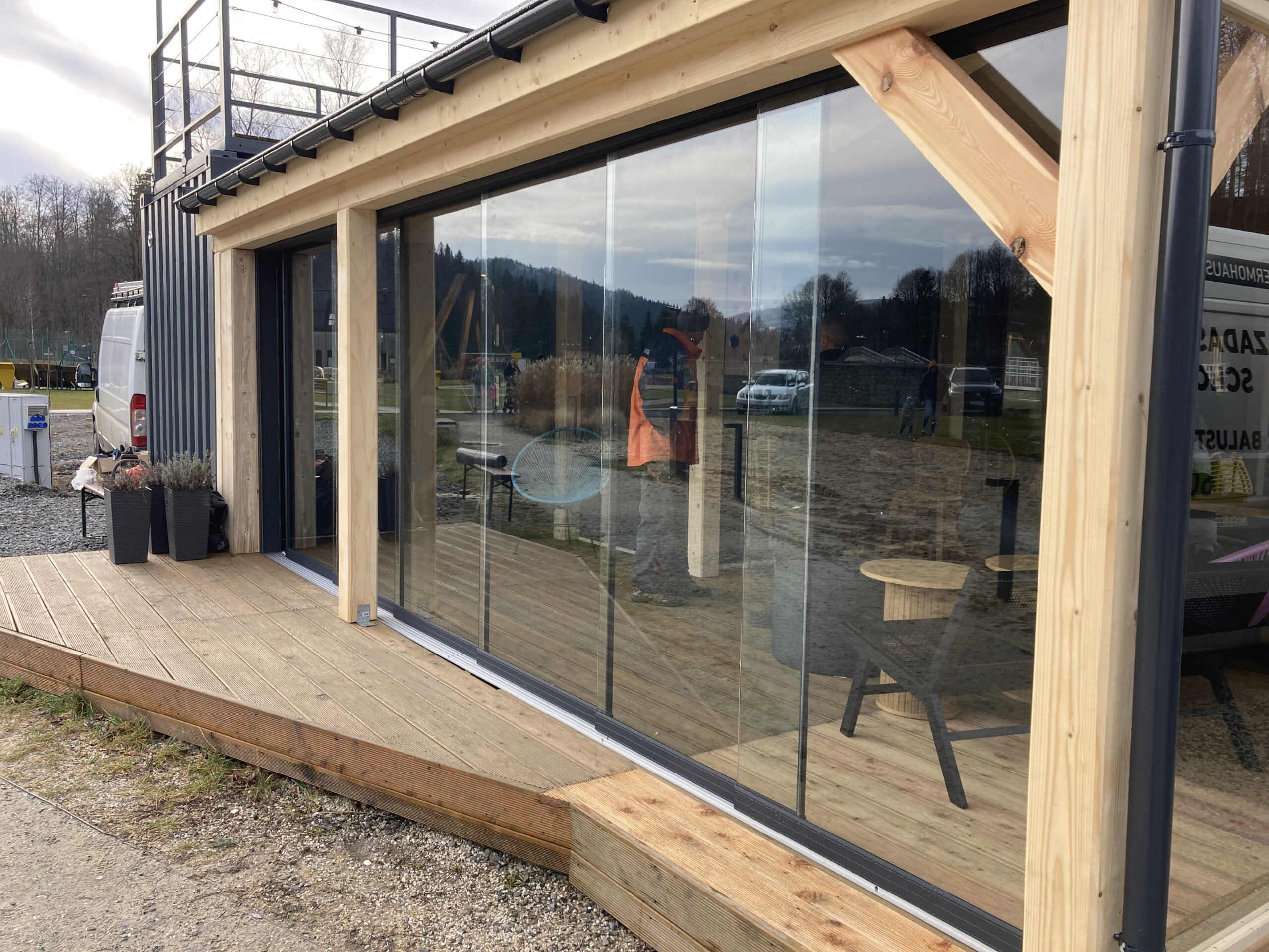 System drzwi przesuwnych szklanych wykonany jest ze szkła bezpiecznego, stosowana do zamknięcia ogrodów zimowych. Możliwość montażu również do konstrukcji drewnianych.